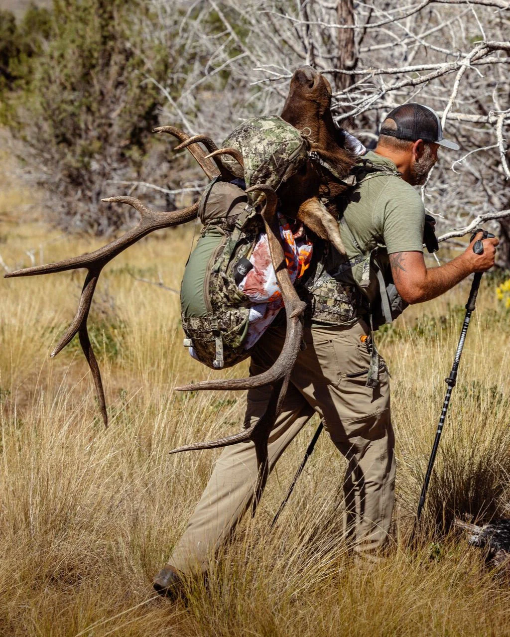 The Team Elk Pack is unlike any other backpack on the market. It has unique features like the patented rifle-back scabbard, a comfortable aluminum frame meant to carry heavy loads and a meat carrying system that allows the pack to be separated from the frame for packing out game from the backcountry. The pack includes a spacious floating lid, deep side pockets, and stretch-material pockets throughout the exterior of the pack. On the interior of the pack you will find stretch pockets and a hydration sleeve and hook.